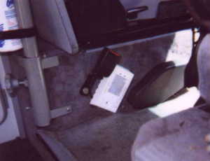 | Here's the propane detector, tucked between the seatbelt and the parking brake by the driver's seat. |