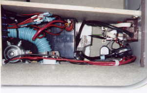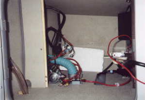 | Just getting started. This is a view down through the storage bin above the hidden compartment, with the acces hatch removed from the bin's floor. The front of the van is toward the top of the picture. The wall between the hidden compartment and the little low storage compartment aft of the fridge has been removed. You can see a thick, straight black line in the corner between the floor an d the left wall of that compartment - that's the wiring conduit that goes up to the bin behind the driver's seat. The blue hose is the water tank fill hose. Nestled in the curve of the hose (but closer to the floor) is the battery relay. To the right, on top of the hose, is the circuit breaker. The white area in the center of the pisture is the styrofoam platform for the battery. On the right, you can see the new, deeper silver electrical box for the 110V circuit breaker, 12V outlet, and invertor switch. The black cable heading out of the picture to the right is the male extension cord that will eventually be plugged into the invertor; it's wired into the brown 110V outlet electrical box. Below that, coming out of that same brown electrical box, is the female extension cord for the battery charger. At the bottom-left corner of the picture is the little "notch" (beneath the clear hoses) through which the manual battery connect switch can be reached. | |