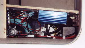 Now the battery's in, and the wall has been replaced. A little above the center of the picture is the red "positive" terminal of the battery. On the far left of the picture, near the top, you can just see the fuses sticking out from the new fuse panel. Above and to the right of that are the wires that come out of the fuse panel, all terminated with quick-disconnects and labeled with little white tags. Toward the bottom of the picture, you can see the red 8-gauge battery cable. On the far right, it curves toward the floor, where it goes out a hole (which you can't see). Near the right side of the pisture, in the center, is the 12V outlet for the invertor, mounted on the floow. It has a little wite "door" covering it, which in the picture looks kind of like an upside down white "U" with a black edge |