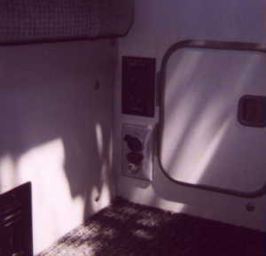 The electrical outlet looks the same as before, but now its bottom socket is connected to the invertor, rather than the shore tie. The original aluminum circuit breaker panel has been replaced with a gray plastic one (I chose gray to retain the original "look"), which now holds the new 12V outlet (top, with a cap over it), the power switch for the the invertor (middle, lights up red when on), and the original 110V circuit breaker (bottom). |