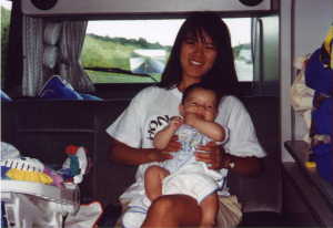 | Carolyn and Kevin. Behind them on the left of the picture you can see the smoke detector and CO detector on the wall, and (in the center) the wide-angle Fresnel lens on the back window. | |