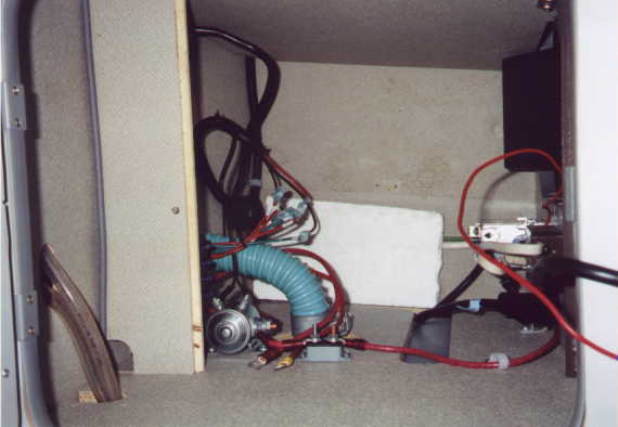 Now the battery's in, and the wall has been replaced. A little above the center of the picture is the red "positive" terminal of the battery. On the far left of the picture, near the top, you can just see the fuses sticking out from the new fuse panel. Above and to the right of that are the wires that come out of the fuse panel, all terminated with quick-disconnects and labeled with little white tags. Toward the bottom of the picture, you can see the red 8-gauge battery cable. On the far right, it curves toward the floor, where it goes out a hole (which you can't see). Near the right side of the pisture, in the center, is the 12V outlet for the invertor, mounted on the floow. It has a little wite "door" covering it, which in the picture looks kind of like an upside down white "U" with a black edge |