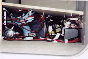 | Just getting started. This is a view down through the storage bin above the hidden compartment, with the acces hatch removed from the bin's floor. The front of the van is toward the top of the picture. The wall between the hidden compartment and the little low storage compartment aft of the fridge has been removed. You can see a thick, straight black line in the corner between the floor an d the left wall of that compartment - that's the wiring conduit that goes up to the bin behind the driver's seat. The blue hose is the water tank fill hose. Nestled in the curve of the hose (but closer to the floor) is the battery relay. To the right, on top of the hose, is the circuit breaker. The white area in the center of the pisture is the styrofoam platform for the battery. On the right, you can see the new, deeper silver electrical box for the 110V circuit breaker, 12V outlet, and invertor switch. The black cable heading out of the picture to the right is the male extension cord that will eventually be plugged into the invertor; it's wired into the brown 110V outlet electrical box. Below that, coming out of that same brown electrical box, is the female extension cord for the battery charger. At the bottom-left corner of the picture is the little "notch" (beneath the clear hoses) through which the manual battery connect switch can be reached. | |
